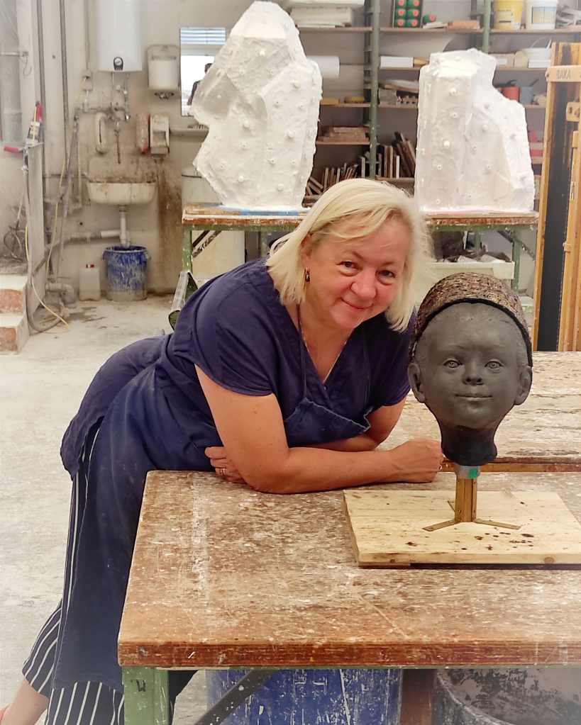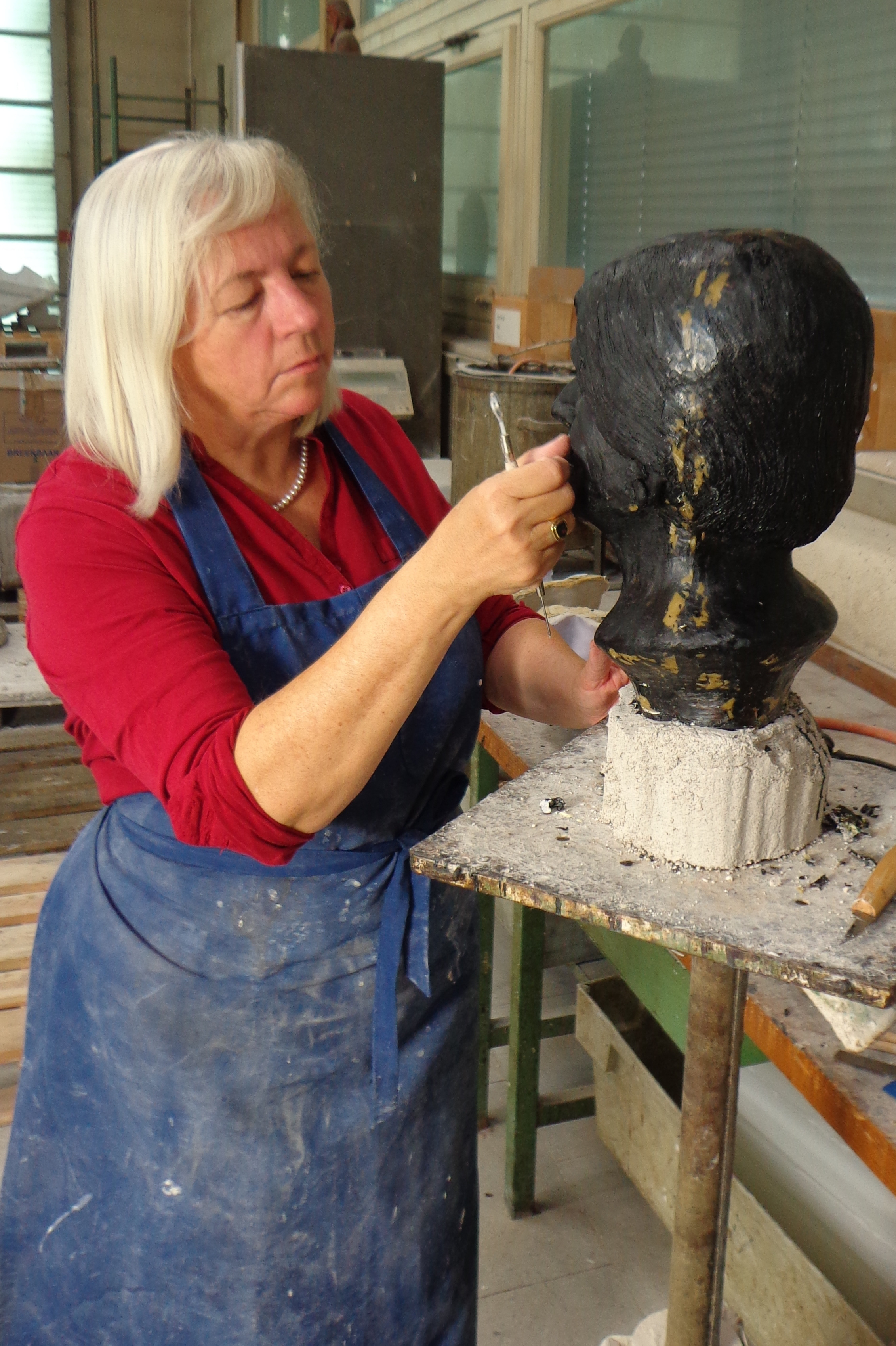 Portraits Dr. Cornelia Hahn Der Enstehungsprozess Thomas Fierl Terracottabüste Ewald Schrade Galerist Mochental/Karlsruhe Erich Glauer Bildhauer Betonguss Kinderportrait mit Haube
